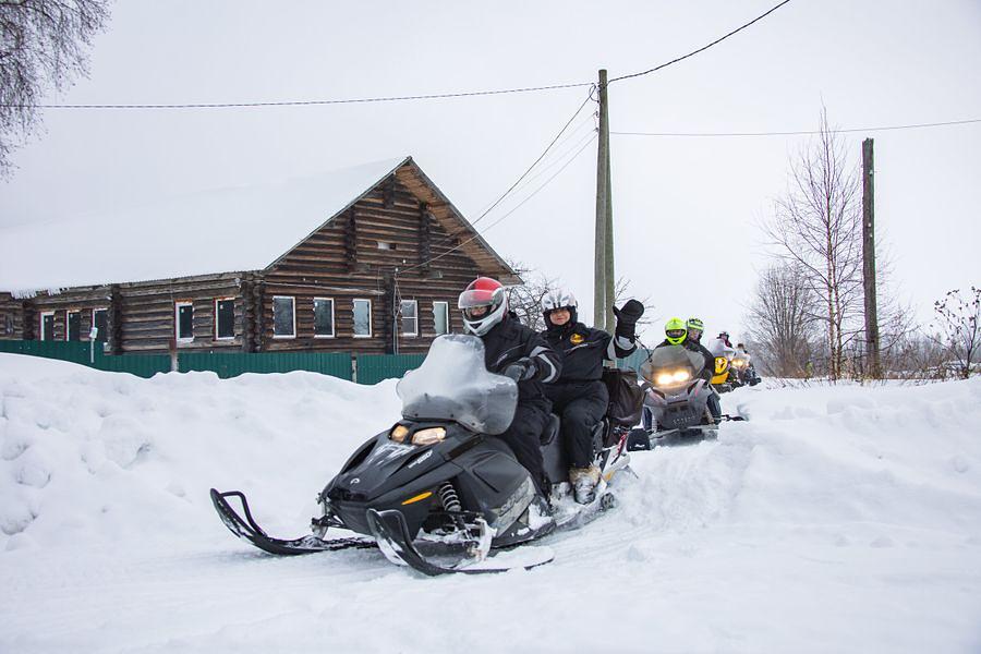 11.00 - Сафари на снегоходах по маршруту «Кижское ожерелье»: д. Ерсеньево – Корба – д. Воробьи – о.Кижи – Вороний остров – Типиницы – Яндомозеро – д. Волкостров – о.Еглов – д. Подъельники – о. Кижи – д. Ерсеньево (80 км.)