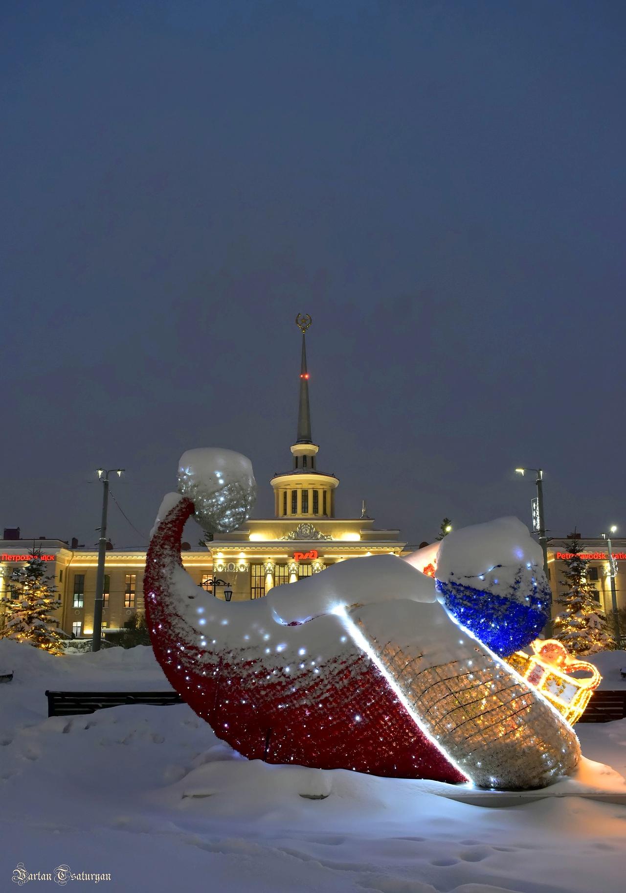 Пройдемся по заснеженной набережной Онежского озера. Здесь вы увидите множество скульптур, памятников и арт-объектов.