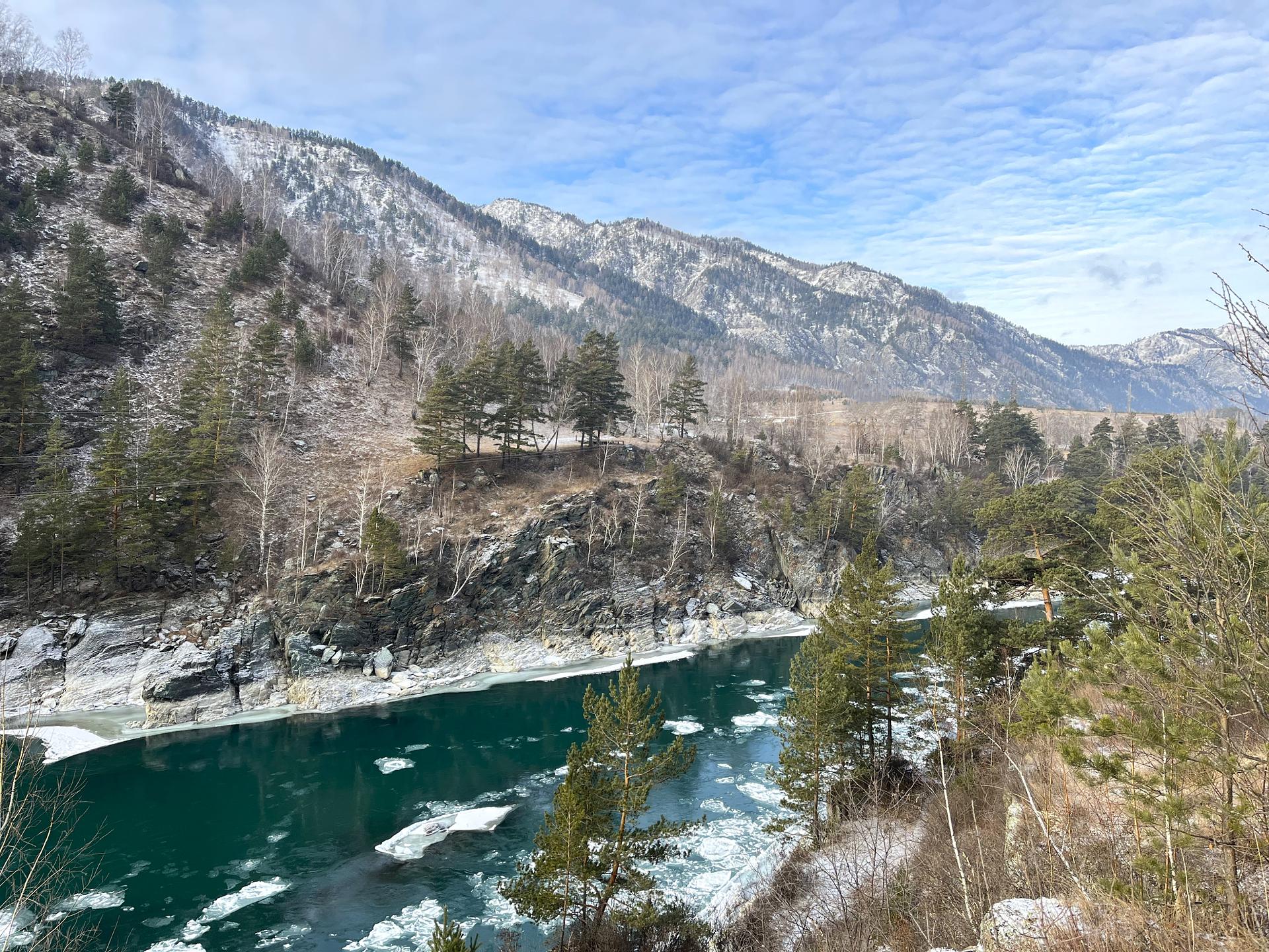 Медитативная прогулка по замерзшей глади величественной реки Катунь – навстречу Голубым озерам или «Глазам Катуни»: два чистейших водоема словно пара сияющих глаз среди бескрайних просторов Алтая.